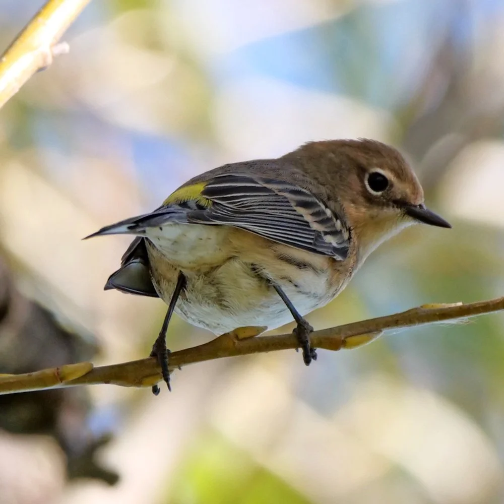 Yellow-rumped Warbler turning its head to peer over its shoulder! You can see little peeks of the famed yellow rump and its black wing feathers ringed in brown. Photo by Dexter Patterson.