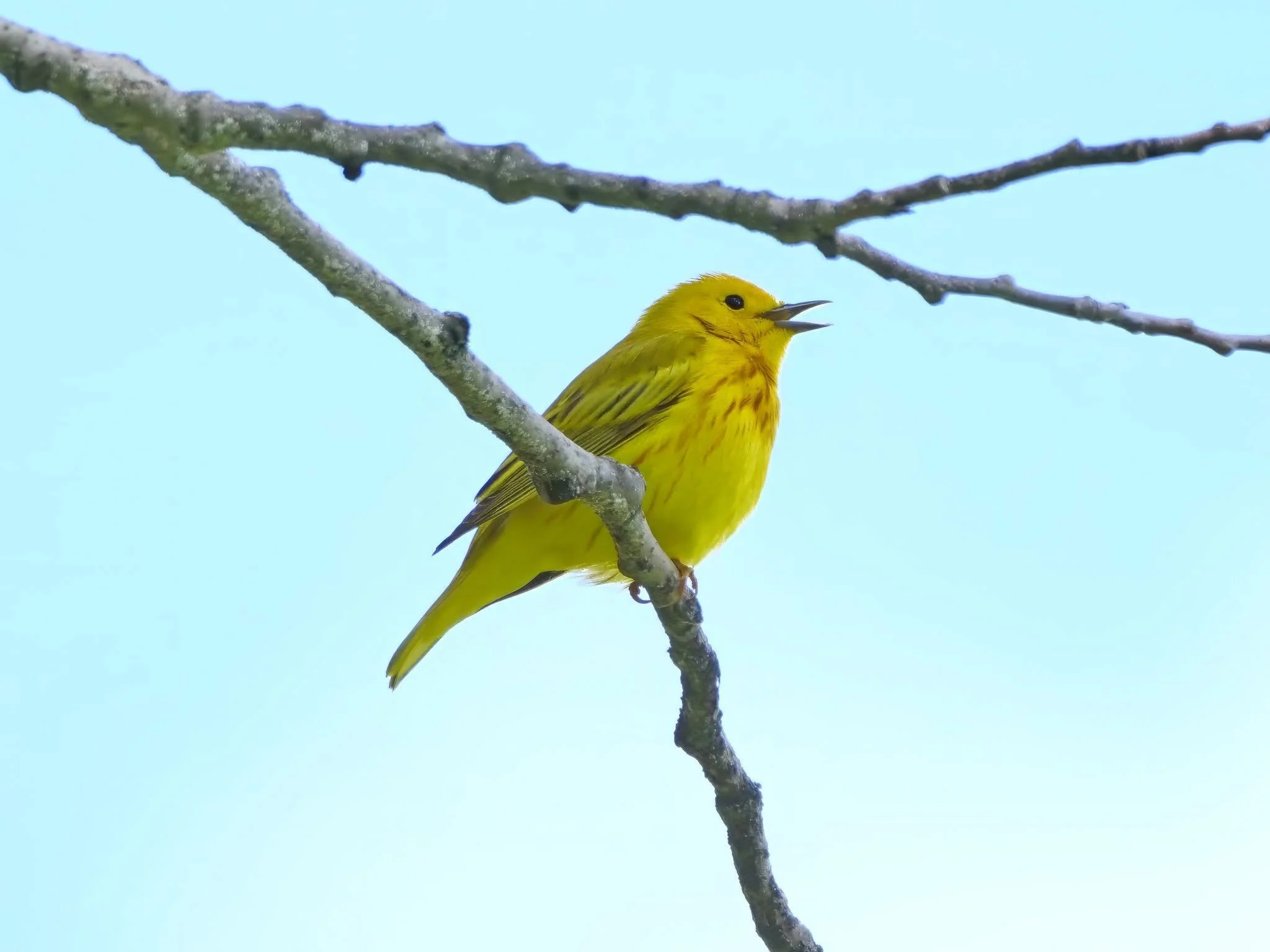 A Northern Yellow Warbler, beak open and singing perched in front of a pale blue sky! Photo by Dexter Patterson.